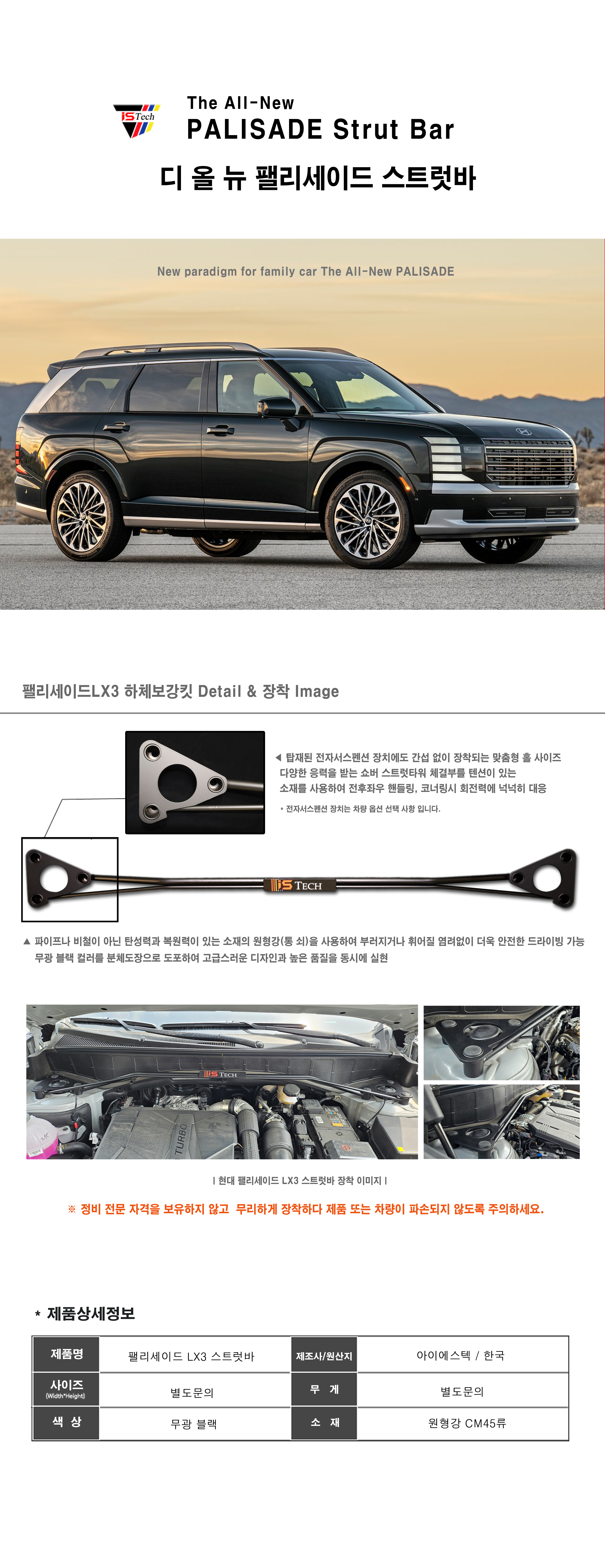 차량 하체 보강 대표 튜닝 더뉴팰리세이드(LX3) 언더바, 스트럿바입니다.