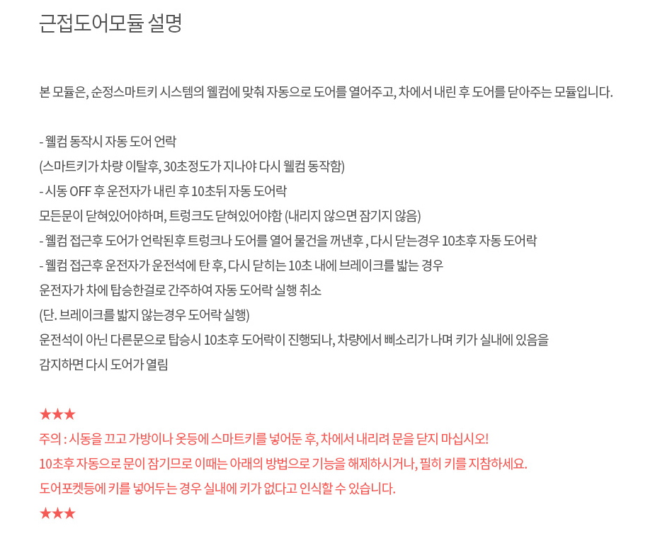 순정 스마트키 시스템의 웰컴에 맞추어 자동으로 도어 잠금&오픈해주는 모듈입니다.