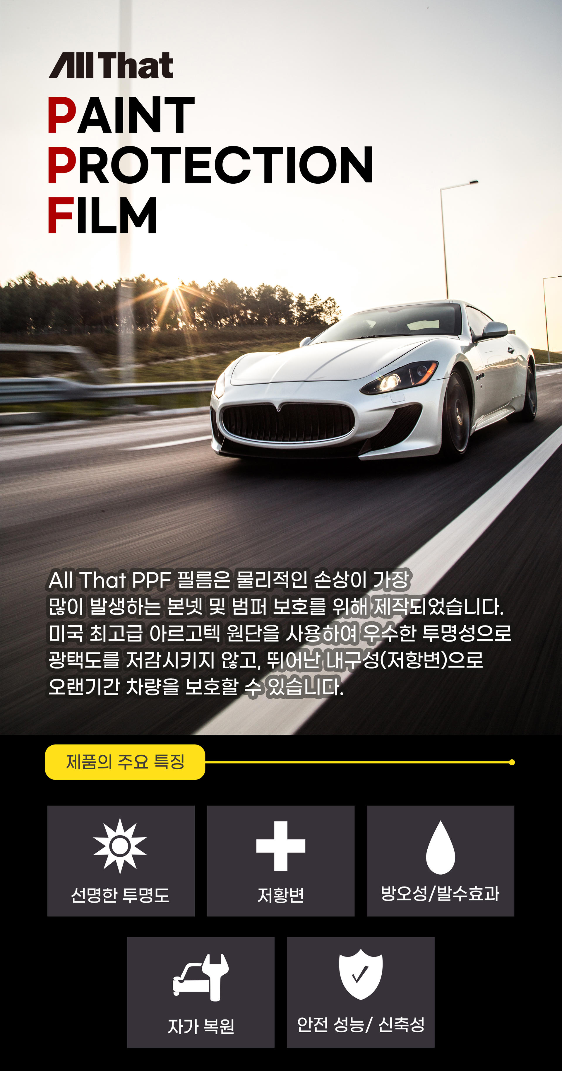 주행중 스톤칩에 의한 본넷 손상은 물론 주차 및 일반 주행시 가장 많은 손상이 일어나는 앞/뒤 범퍼의 코너를 보호하기 위한 패키지 입니다.